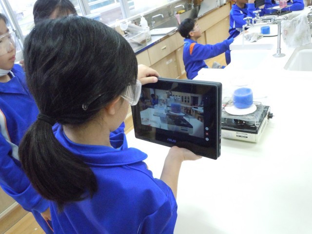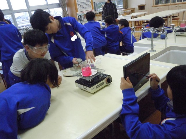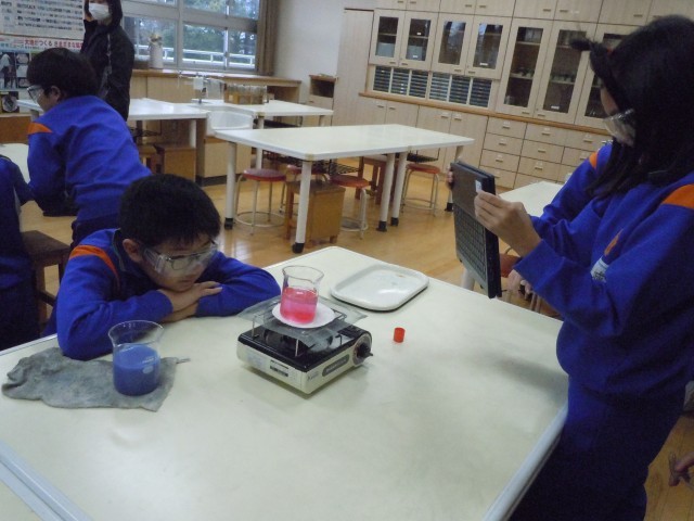 理科の時間です。水はどのように温まるのか実験しています。透明な水の動きを分かりやすくするために、絵具を沈めました。ビーカーの中の水の様子が分かりやすく観察できました。