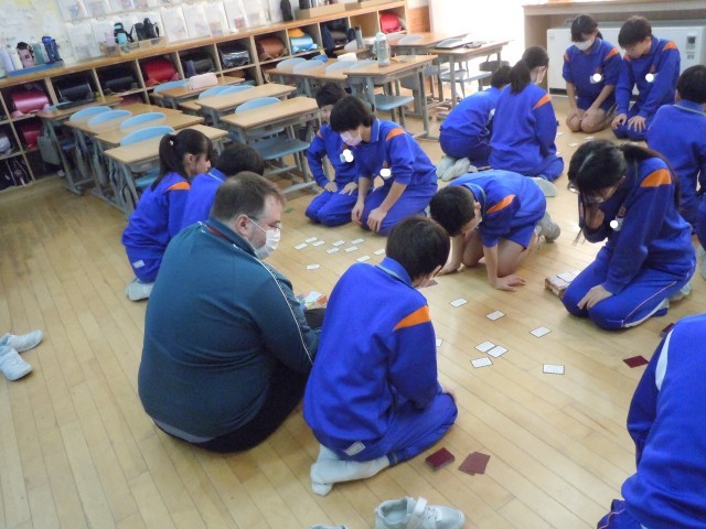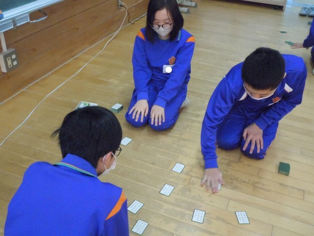 外国語の時間です。ジャパニーズカルタをしています。百人一首です。日本の文化です。