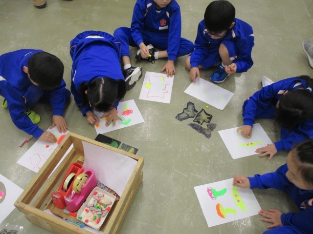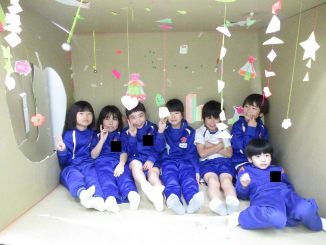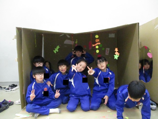 テーマをもとに自分たちで絵を描き、段ボールの洞窟に貼りました。