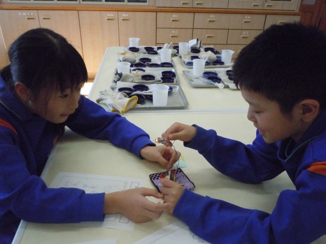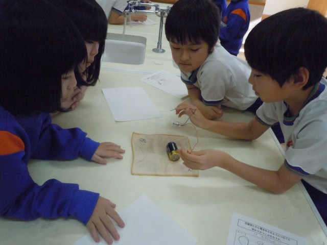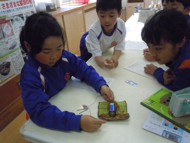 理科の時間です。明かりが点く豆電球のつなぎ方を予想しました。予想通りになったかどうか実験で確かめています。