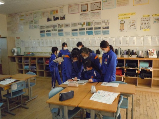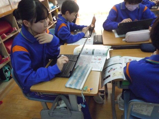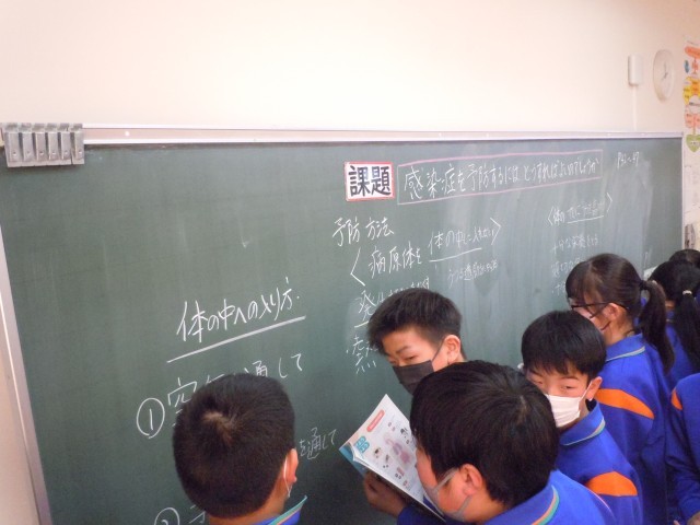 保健の時間です。感染症から身を守る方法を考えています。まず、どのようなルートでウイルスが体に入るのか学んだ後まとめています。日頃の予防を理論立てて理解した時間です。