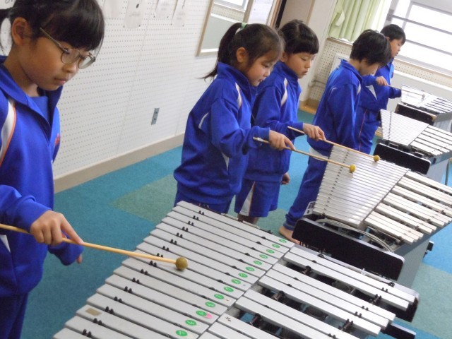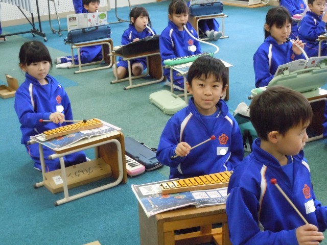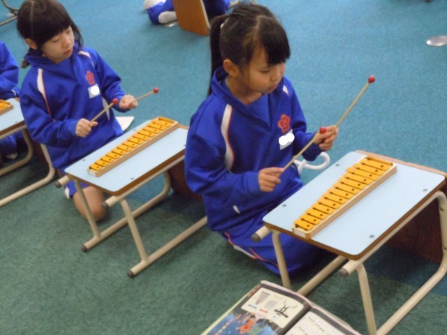 音楽の時間です。「きらきらぼし」を鍵盤ハーモニカ、鉄琴、ミニクロッケンで合奏しています。順番にどの楽器も使って演奏しています。3分間の練習タイムで準備し、みんなとリズムを合わせて演奏しています。