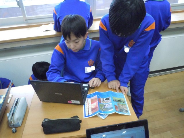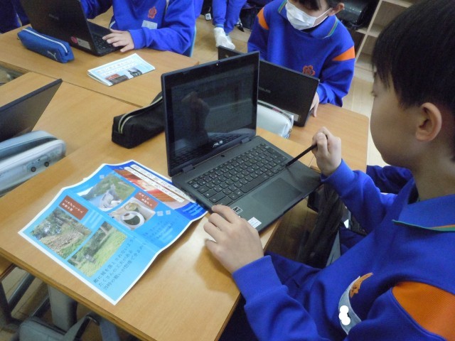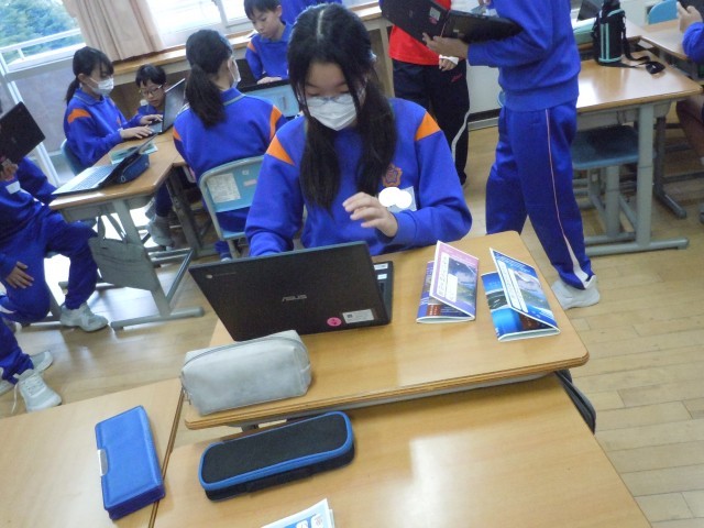 国語の時間です。一人r一人が作った「おすすめのパンフレット」を読み合っています。ポイントは、読み手の心を動かす言葉や、目的に合わせた魅力的な写真、書き表し方です。どの作品も力作ぞろいです。