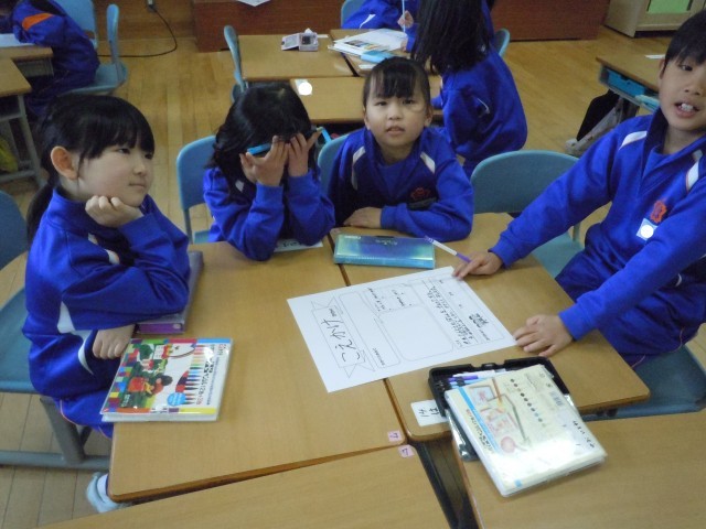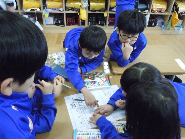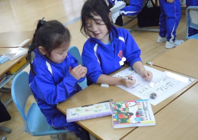 学級活動の時間です。係の打合せをして看板を仕上げています。役割分担をしたり、仕事を確認したり。とても張り切っています。