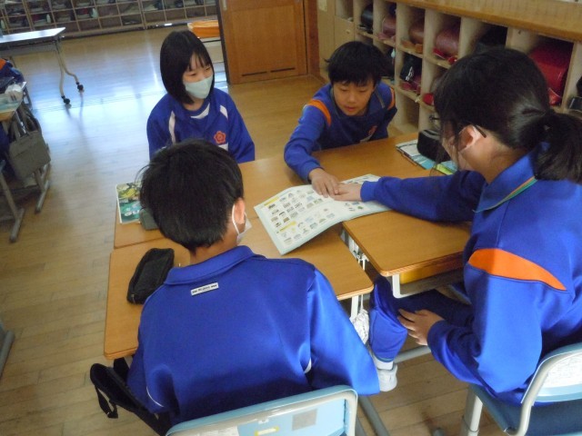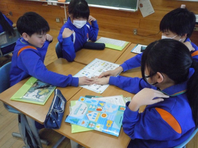 外国語の時間です。ALTの先生が言った言葉を指さしています。かるたのように素早く反応しています。