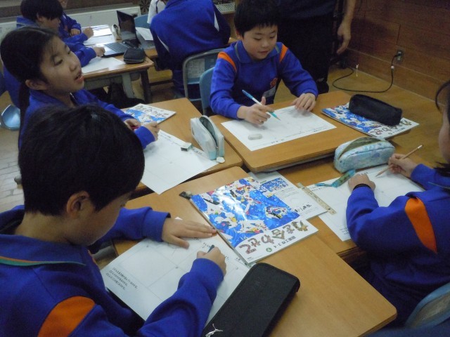 図画工作の時間です。「へんてこ山の物語」のお話の絵を考えています。思いついたへんてこな形からお話を考えます。へんてこなことが次々浮かんでくるからか、みんなクスクス笑いながらへんてこな形を次々に描いています。