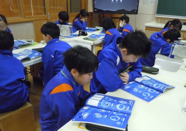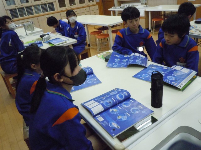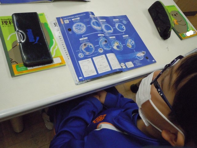 理科の時間です。メダカの命の誕生の学習をもとに、ヒトは子宮の中でどのように育つのか疑問を出し合ったり、予想したりしています。