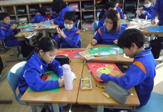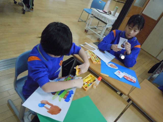図画工作の時間です。白い画用紙に描いていた不思議な乗り物を切り取って、色画用紙に貼り、周りの物を描き足しています。白い画用紙に描かれていた乗り物が、色画用紙に貼られることで、いきいきとした動きが加わって見えてきます。