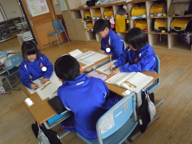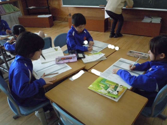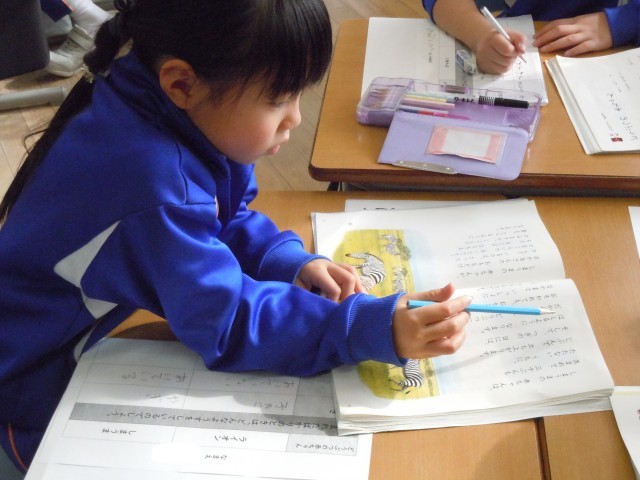 国語の時間です。「どうぶつの赤ちゃん」を読んでいます。ライオンの赤ちゃんとしまうまの赤ちゃんを比べて、様子が分かる言葉を教科書から選んでワークシートに書いています。真剣に文を読んでいます。