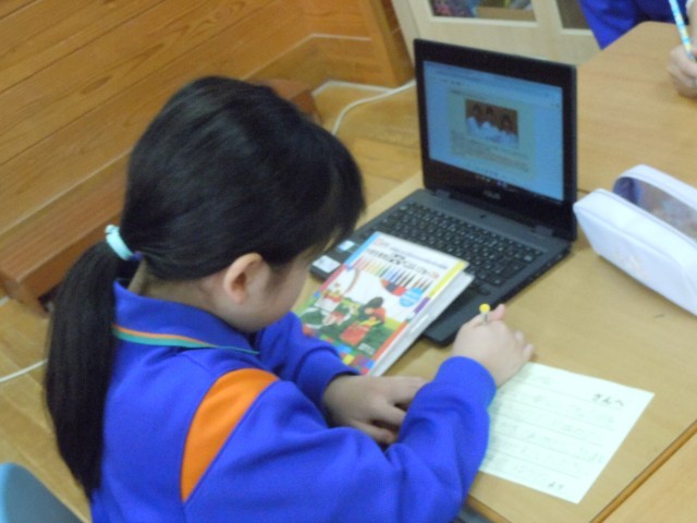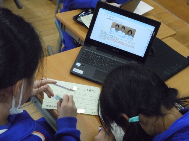 今日から給食週間です。給食に携わる方々に感謝の手紙を書いています。3年生は、配膳員の方にお手紙を書いています。配膳員の方の顔と主な仕事が書かれたタブレットを見ながら、気持ちを文に表しています。