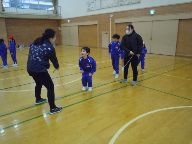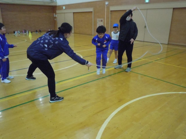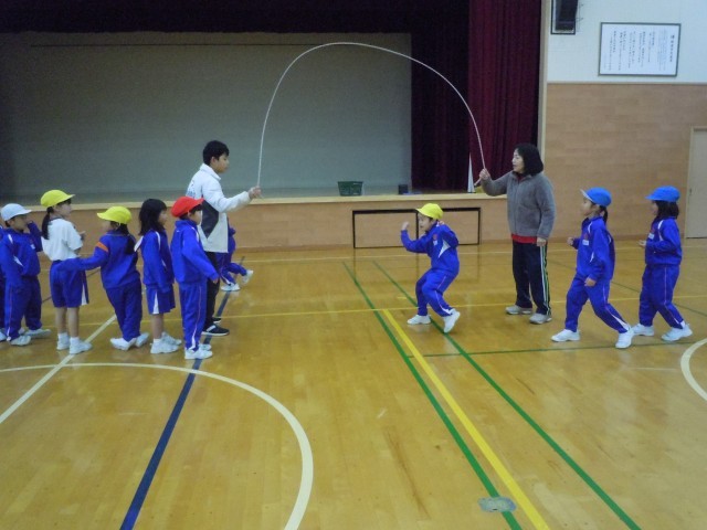 体育の時間です。長なわ8の字跳びにチャレンジしています。なわに入るタイミングをつかむまで、怖い気持ちとの闘いのようです。上手に入れるとみんなで喜んでいます。上の学年のように走って跳びチームが8のように見えるまでがんばりたいです。