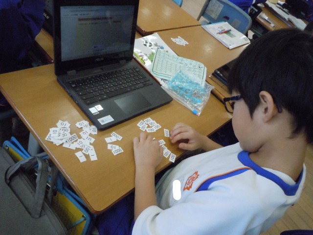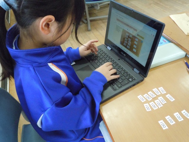 算数の時間です。100をもとに大きな数を説明しています。写真を撮って説明を書きこんだり、言葉で説明する動画を撮ったり、1ではないものを1とみる算数の考え方を身に付けています。