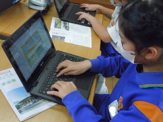 社会の時間です。学習の終わりの時刻が近づき、振り返りをしています。富山市の役割について調べまとめたので、自分なりの学びを整理する振り返りの静寂が感じられます。