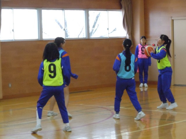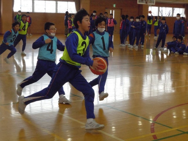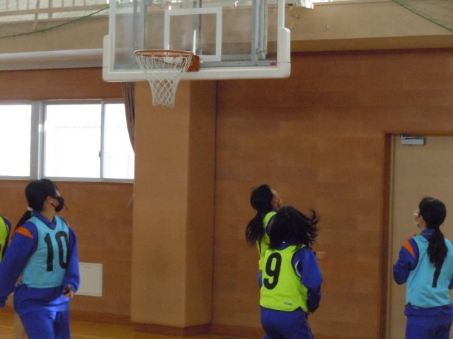 体育の時間です。「バスケットボール」に取り組んでいます。シュートが入ると大変盛り上がります。コートの外からの声援がとても大きく響いています。