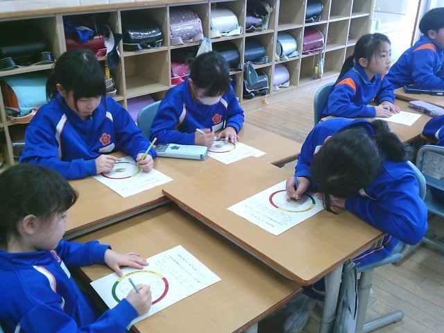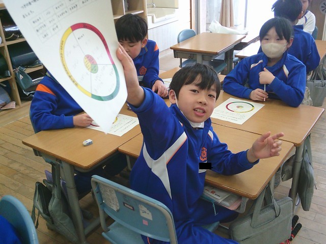 赤、黄、緑の整った栄養をとらないと栄養の木が枯れてしまうという紙芝居を聞き、