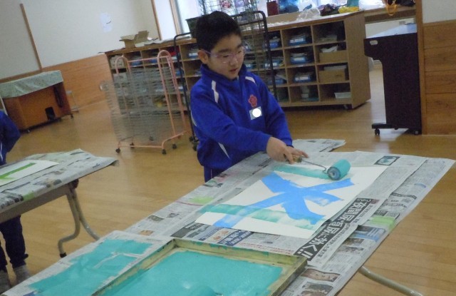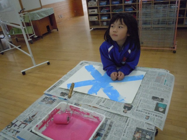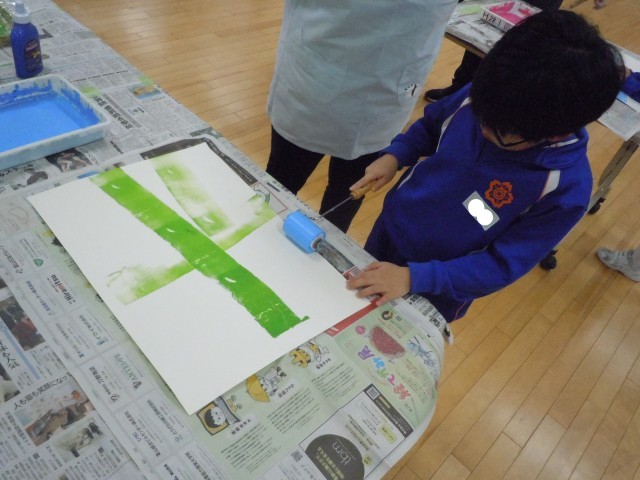 図画工作の時間です。ローラーで模様を描いています。2色目を決め、1色目の上から色を重ねます。どこにどんなふうに色を入れるかは自由です。思いのままに描いています。