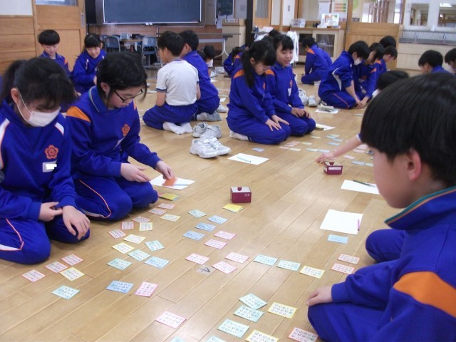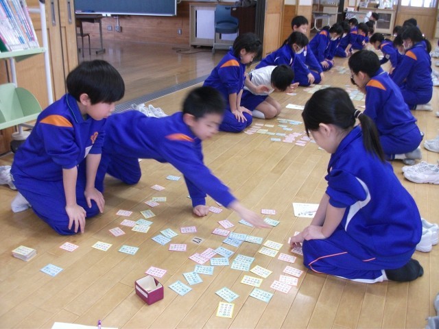 初めての百人一首に挑戦しましたが、たくさんの句を覚え、上の句で取る姿が見られました。