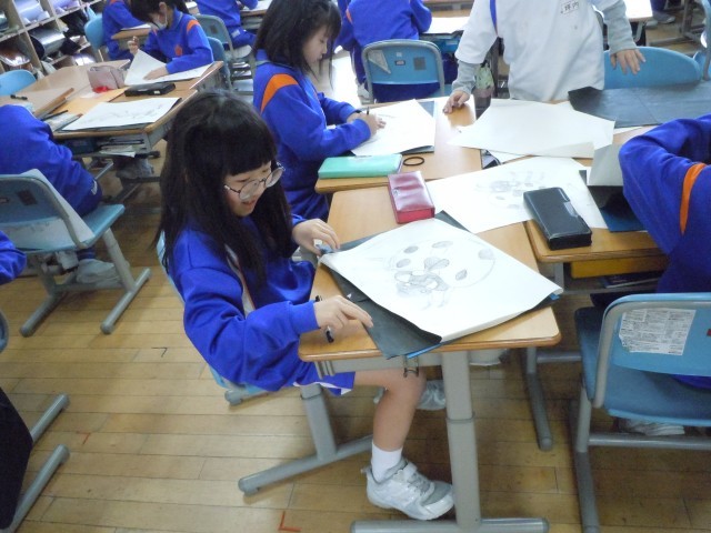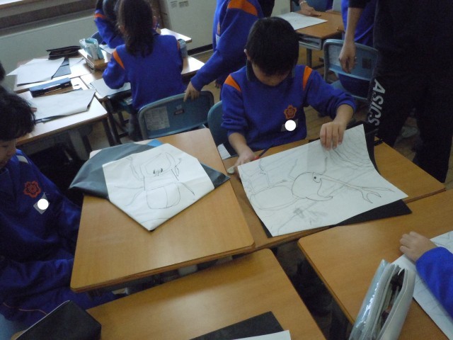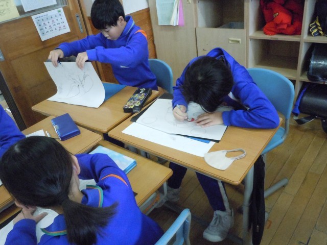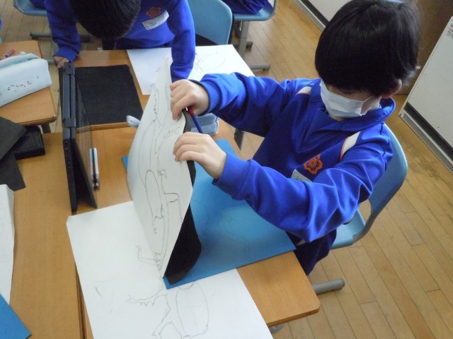 図画工作の時間です。カーボン紙を板と下絵の間に挟み、赤の色鉛筆でなぞって板に下絵を写しています。初めて使うカーボン紙に、「すごい」「写ってる」と確認しながら取り組んでいます。
