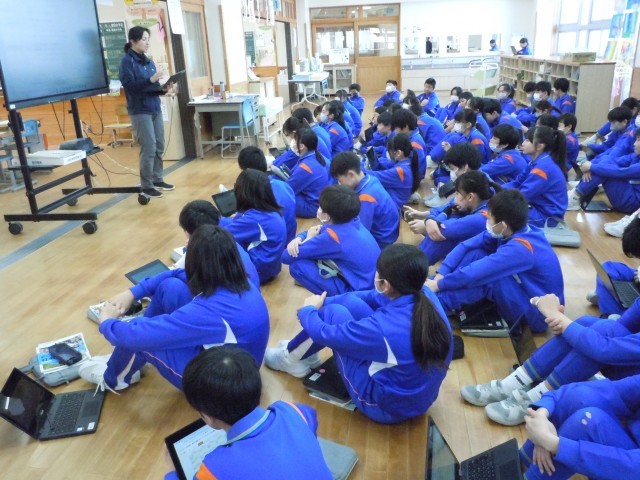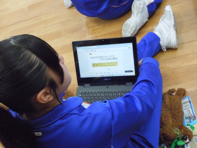 社会の時間です。歴史の学習の総仕上げに取り組むオリエンテーションを行っています。自分でテーマを決めて時代をつないで考えます。すぐにテーマが決まる子もいますが、じっくり考えている様子の子もいます。