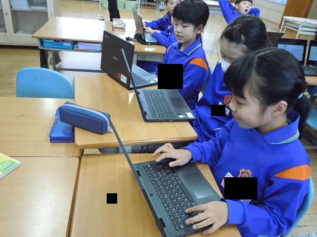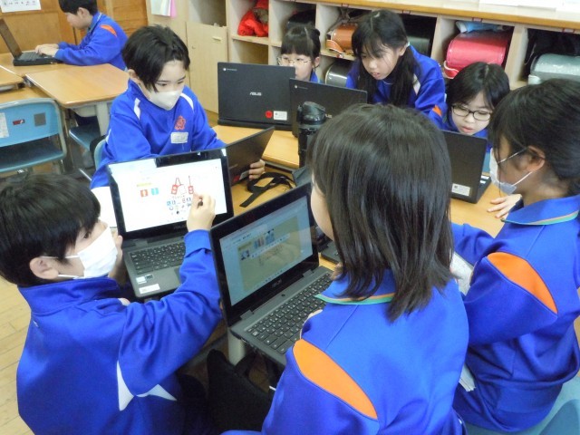 総合的な学習の時間です。先日、社会福祉協議会の方にユニバーサルデザインのことを聞き、今度は自分たちで調べています。予想外にたくさんあると感じているようです。