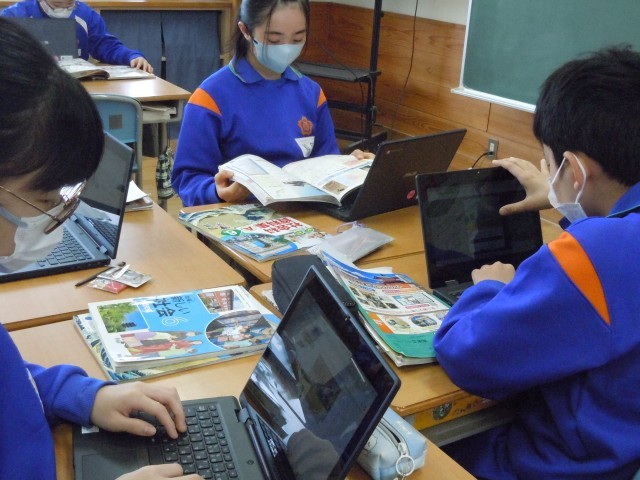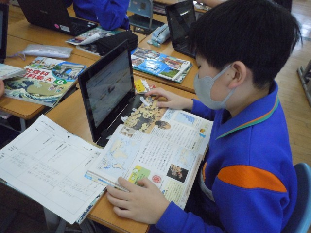社会の時間です。昨日、学年でオリエンテーションが行われた「○○でつなぐ日本の歴史」の自分で決めたテーマにしたがってまとめを始めています。教科書に付箋を貼り、関連をチェックする子、今までの学びのカードを確認する子、構想をメモする子等、着々と進んでいます。
