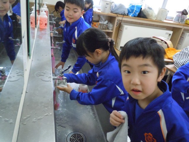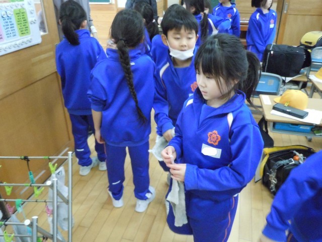机椅子がオープンスペースに出ています。そこでアップデートタイムをして、教室の床を水拭きしています。ぞうきんを冷たい水できれいに洗って片付け、帰る準備です。いつもと違う様子に何だか楽しそうです。この後、ワックスがかけられるので、月曜日、床がピカピカになっていると思います。