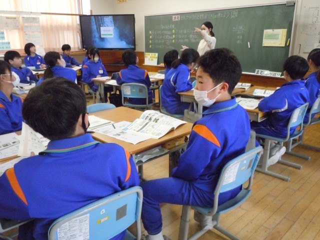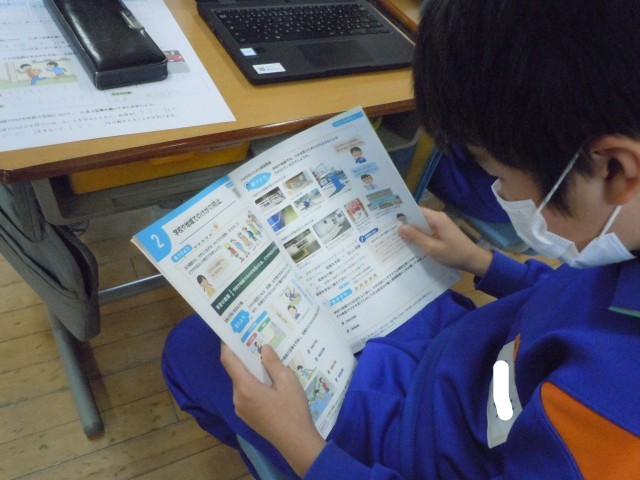 保健の時間です。「けがの防止」について考えています。身の回りの危険個所を考えることも大切ですが、一人一人の行動の仕方も大切です。