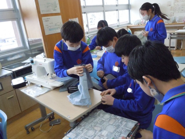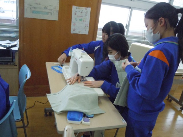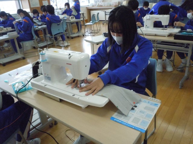 家庭科の時間です。身の回りの小物をつくっています。ミシン掛けのこつを思い出したようで、直線縫いは余裕でできているようです。
