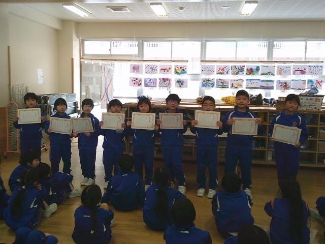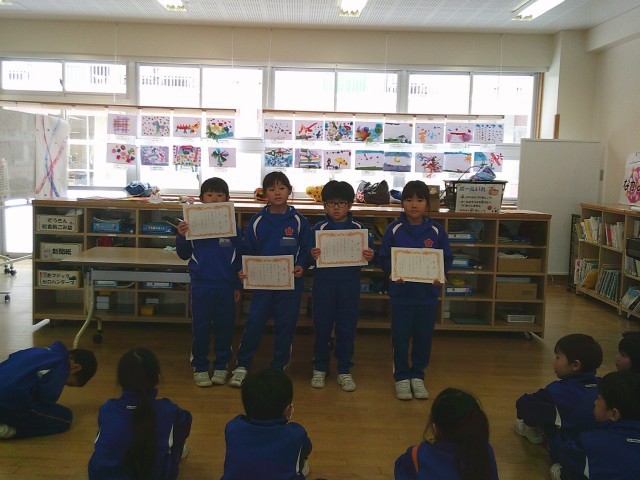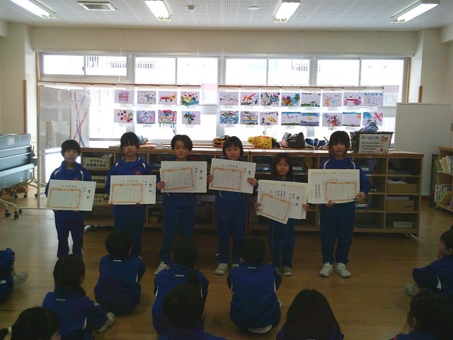 校内書初大会や先日の1年生かるた大会で入賞した子供たちに、賞状を渡しました。