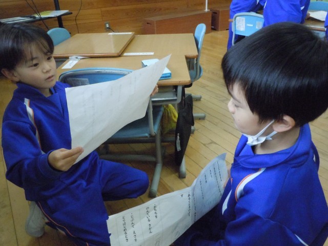 国語の時間です。自分で調べた動物の赤ちゃんについて友達に伝えています。自分で調べたので、自信をもって伝えています。