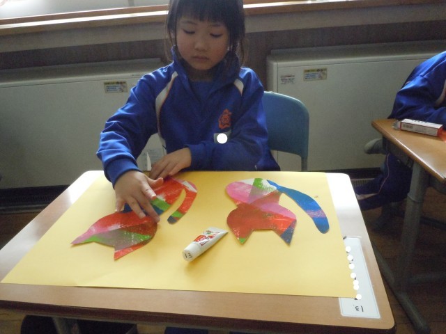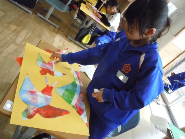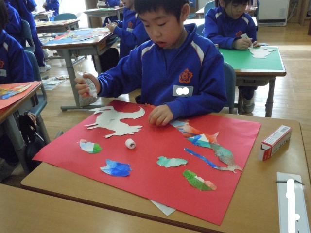 図画工作の時間です。時間をかけて粘り強く取り組んできた生き物のシルエットが見えてきました。カラフルでかわいらしい生き物がたくさん見えます。
