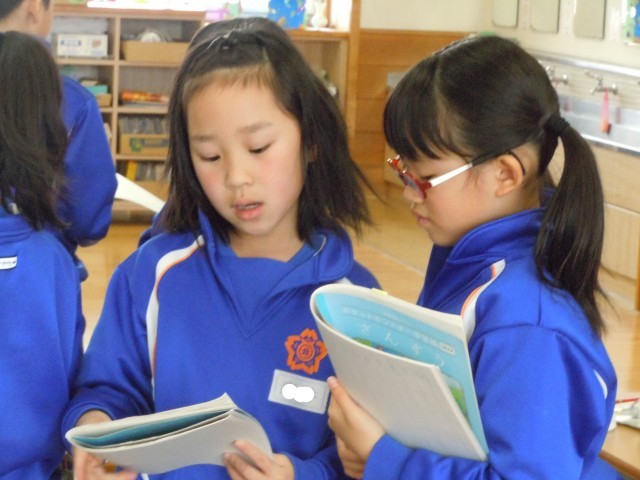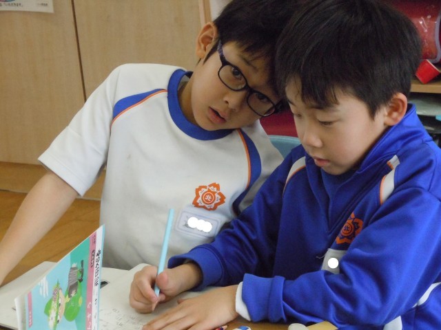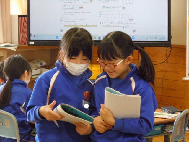 算数の時間です。100㎝は1mと学習しました。それよりも長い長さを友達に説明しています。単位を2つ使います。mと㎝です。