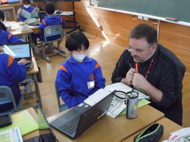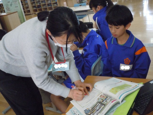 外国語の時間です。This is my town.に続けて、自分たちの町の紹介を考えています。ワードブックを使ったり、観光名所をタブレットで調べたりして英文で書いています。先生が相談に乗ってくれるので、分からないことを気にせず書いています。
