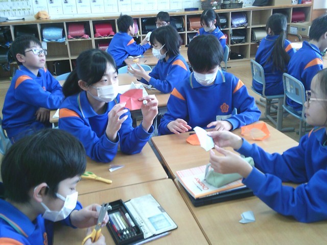 色紙に円をかき、3回折り曲げた後、はじの部分を切って8角形をつくりました。