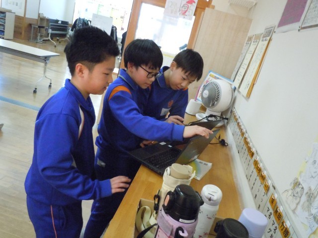 国語の時間です。伝えたいことをスピーチする原稿を書きました。このことについて全員分のキーワードをAIに分類させ、自分と違う考えの友達のところに話を聞きに行っています。友達と交流するきっかけにAIを使っています。