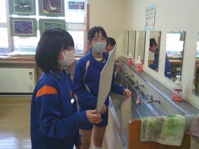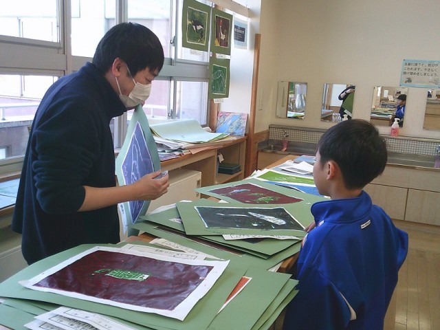 作品が完成した子供は台紙に貼り、名札を付けました。板をきれいに洗い、乾かした後、家に持ち帰ります。