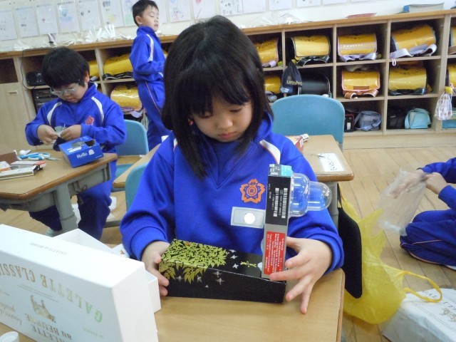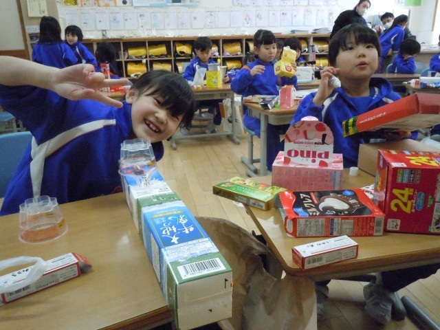 図画工作の時間です。箱と箱を組み合わせて、並べたり積み上げたりしてつくりたい物をつくっています。箱の形の特徴を捉えてつくり、机の上からこぼれそうです。