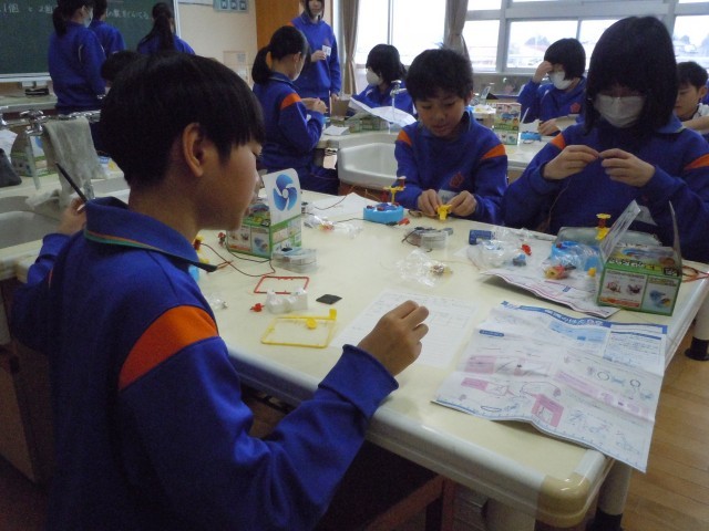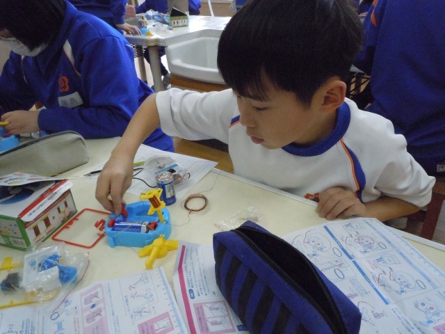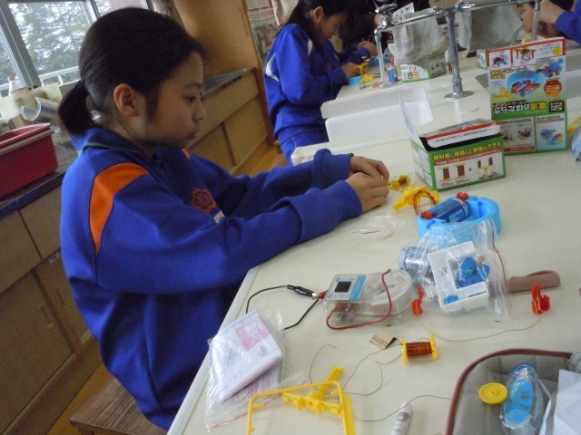 理科の時間です。電磁石に流す電流の大きさを変えて、電磁石の力の変化を調べています。調べたいことを調べるためにきちんと条件を整えて実験しています。