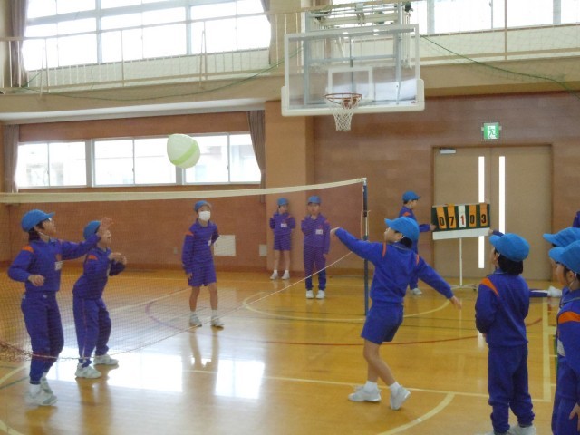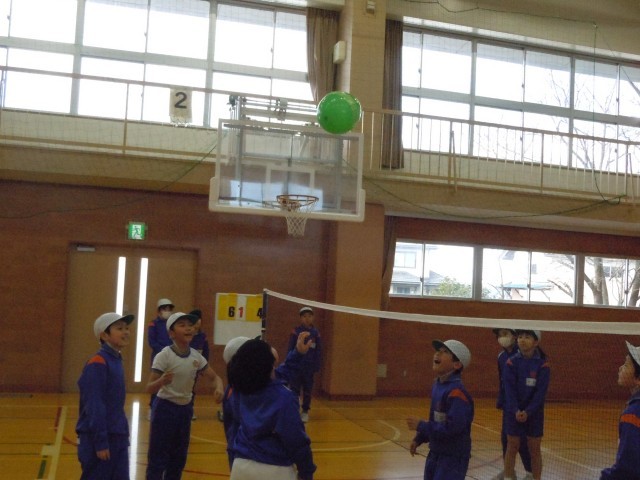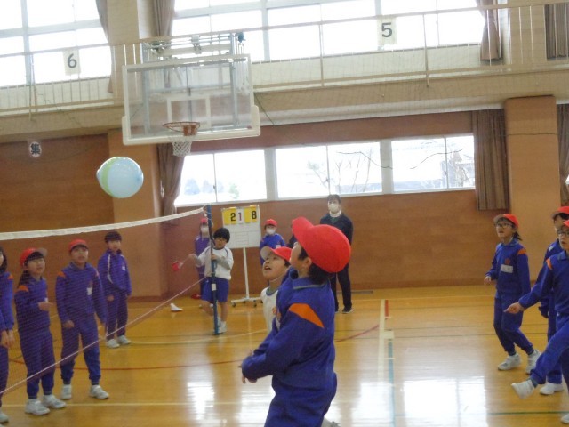 体育の時間です。風船バレーをしています。風船にテープを巻き、ほんの少し重さを加えて落ちてくる速さを調整してあります。ビーチボールやソフトバレーのボールよりもかなりゆっくり落ちてくるので、子供たちが動いてボール下まで移動するには十分な時間があります。痛くなく、優しいボールなので、毎時間歓声が上がっています。