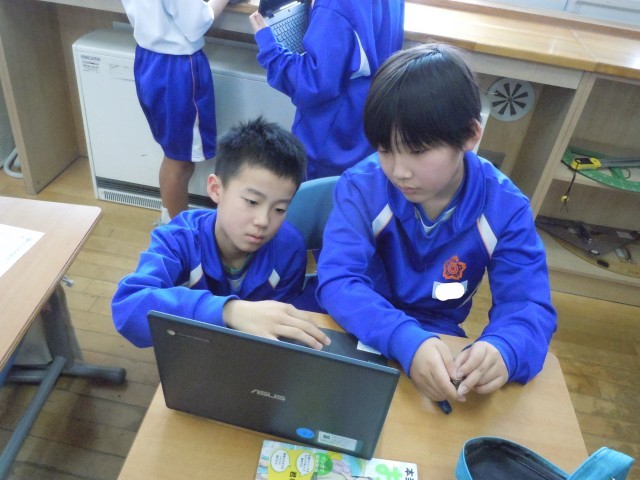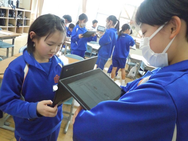 国語の時間です。言葉と言葉や文と文のつながりについて学習しています。例文を読んで分かりやすいのはどちらか理由を添えて説明しています。