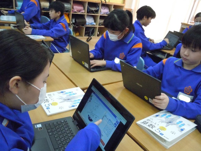 算数の時間です。円周率を使うと円周が分かることを学習しました。円周率を使って計算しています。円だけでなく、半円も計算できそうです。