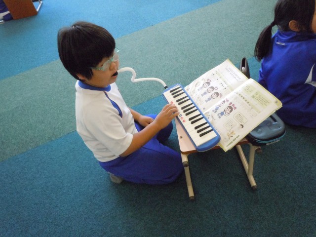 音楽の時間です。「とんくるりん ぱんくるりん」を演奏しています。レ・ミ・ファ・ソの音を使って演奏します。自信をもって演奏できるように一人練習の時間は集中しています。
