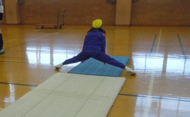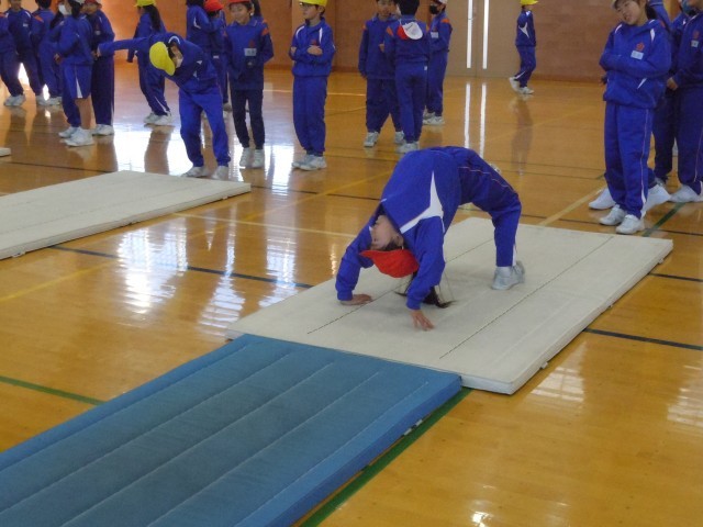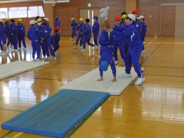 体育の時間です。3つの技を組み合わせて練習しています。スムーズにつなげるのは難度が高いです。