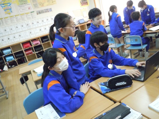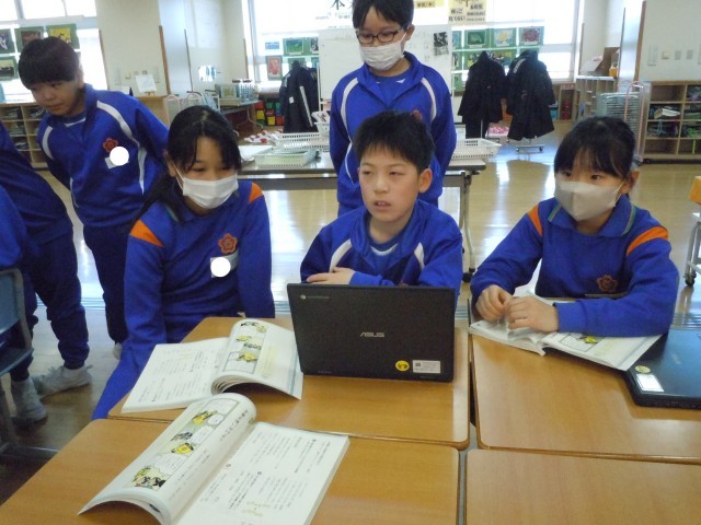 国語の時間です。1年生にあてた教科書の例文を直しています。難しい言葉を分かりやすい言葉に直したり、長い文を短い文に分けたり。読む人の立場になった文を考えています。