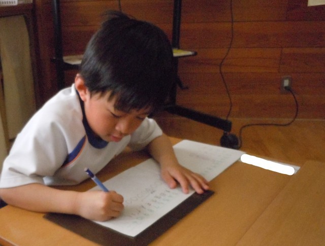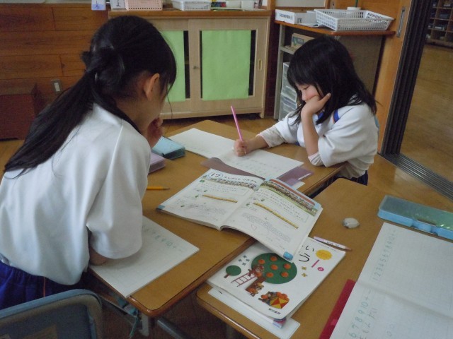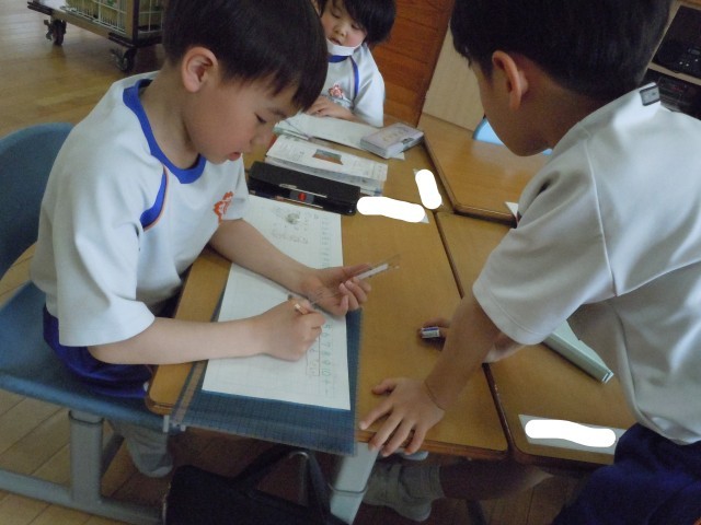 算数の時間です。「○○さんは前から6番目にいます。後ろに4人います。みんなで何人いますか。」について図をかいて考えています。言葉を図に表すことで簡単に式にできます。ただ、「なんばんめ」は使い慣れていないと状況が分かりづらいようです。図をかいたり、ブロックを操作したりする力がついてきました。