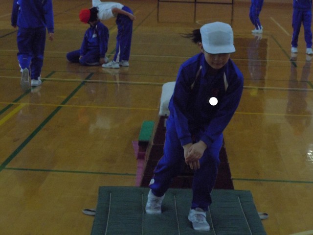 体育の時間です。とび箱に挑戦しています。ちょっと怖くなって、とび箱の前でスピードが落ちそうになりますが、思い切ってチャレンジする友達の姿から「わたしも」という姿がみられます。