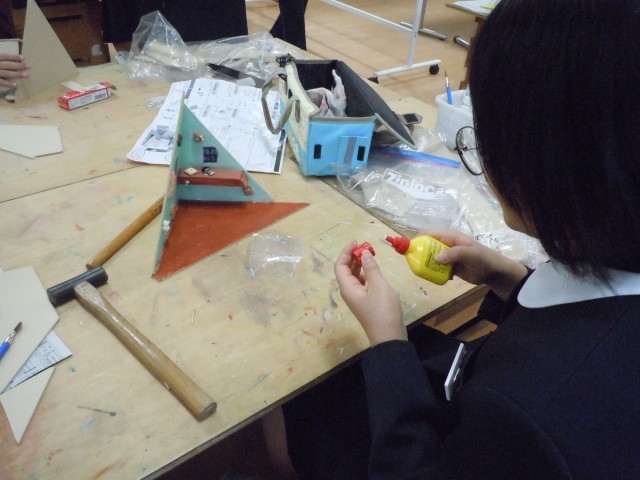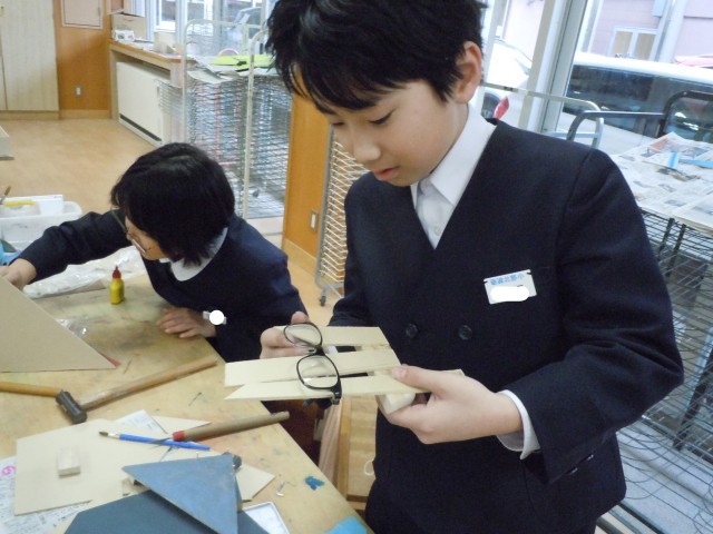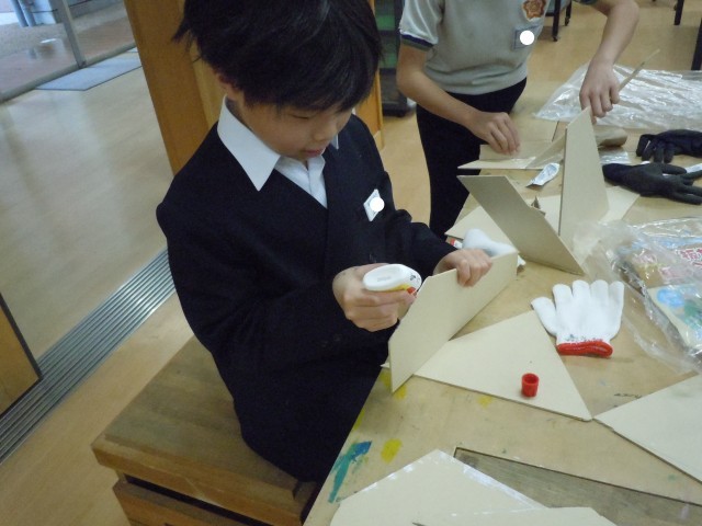 図画工作の時間です。「カクカク板」を組み合わせて立体作品をつくっています。形を楽しんでいる子もいますが、使えるようにと丈夫に組み立てたり、便利ポイントを考えて使えるようにしたりとても楽しそうです。