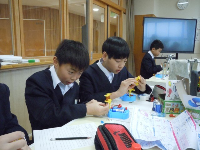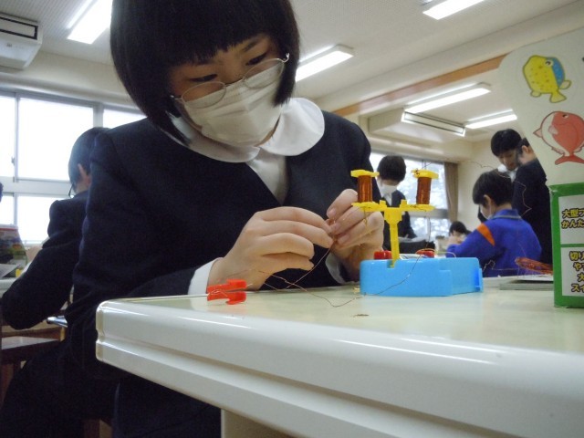 理科の時間です。100回巻のコイルと200回巻のコイルの電磁石のパワーを調べています。回路をつなぐのに苦労しているようです。
