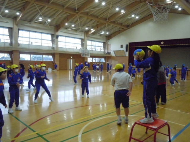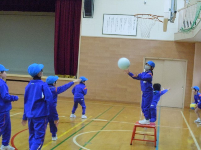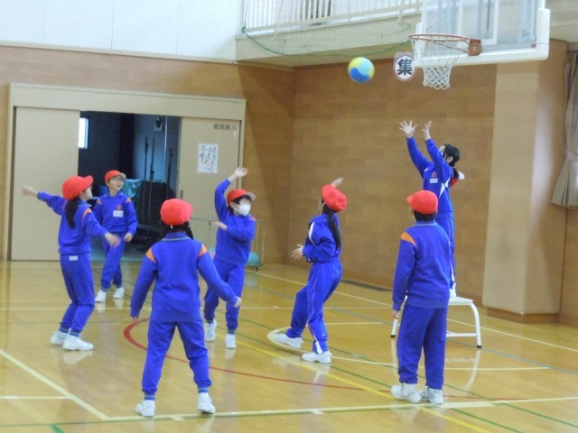 体育の時間です。ポートボールの学習が始まりました。ルールの確認をして、基本の動きを練習しています。初めての競技なので、少し戸惑っています。