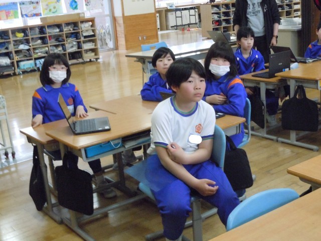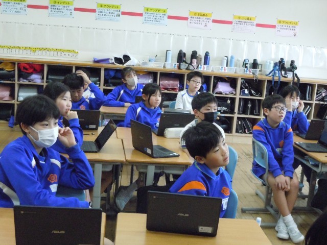 理科の時間です。「生き物の1年」の学習を振り返ってNHK for school を見ています。自分のタブレットで見ることもできますが、みんなで大きな画面を見ると集中している様子です。